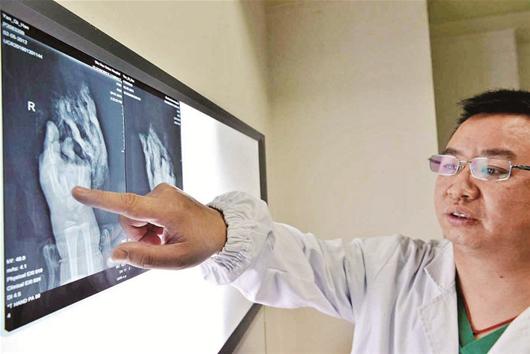 图为:陈振兵讲解患者右手损毁情况 - 新浪湖北