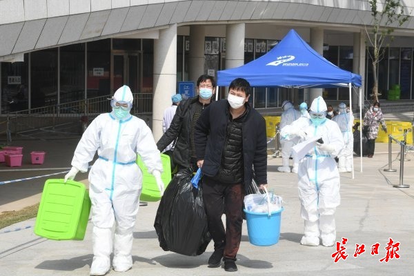 在舱外的大草坡上一片欢腾,医护人员们好不容易坐在草坡上晒太阳。天津支援湖北医疗队的队员们高喊“中国加油,武汉必胜”,一起合影留念。湖南医疗队队员们拿着手机,一边录下美丽的景色,一边自拍。陕西医疗队的几名医护人员对长江日报-长江网记者说,“别采访我们,你们应该多宣传本地的志愿者,接送我们的公交司机,每天半夜三更依然守候,非常辛苦!”