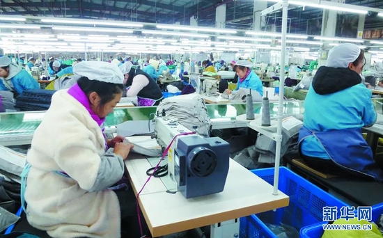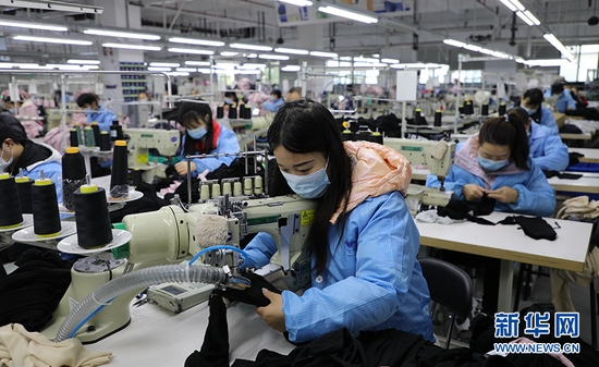 图为湖北嘉麟杰服饰有限公司员工节后赶订单忙生产。新华网发 向继华摄