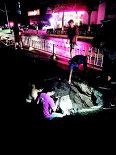 现场抢修人员介绍,下面是一根直径600毫米的排污管,应该是破损后水流将路面下方的泥土带走淘空以致路面塌陷。由于地下排污管网比较深,漏损较难发现,以后将加强巡查。此次人车损伤情况,也已向领导报告。