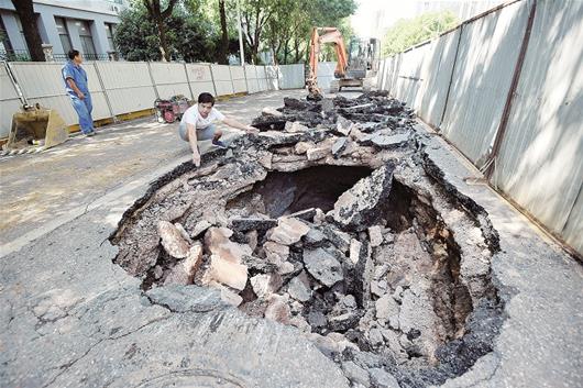 图为:路面坍塌现场 楚天都市报记者萧颢摄记者现场看到,塌陷区域有五六平方米,占去一股车道,深约2米,坑底有污水流淌。凌晨4时左右,水务排水抢修人员赶到,在周围竖起了施工围挡,挖掘机进场开挖路面,单向两股车道已无法通行,借对向一股车道行驶的车辆,也无法右拐上软件园东路。