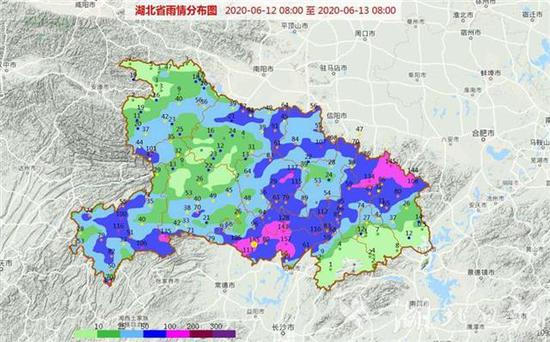 湖北省水文水资源局监测数据显示,6月12日8时至13日8时,江汉平原、鄂东北大到暴雨;鄂西南大到暴雨,局地大暴雨;鄂西北、鄂东南中到大雨。降雨超过100毫米的有荆州公安县、黄冈麻城市、荆门京山市、神农架林区、武汉市汉南区等22个县市区。降雨量50毫米至100毫米的有荆州沙市、襄阳枣阳市等37个县市区。全省面降雨量为33毫米,最大降雨点为公安县沙厂站,降雨量185毫米。预计13日晚上,鄂西南、江汉平原和鄂东北仍有中到大雨局部暴雨,其他地区以阵雨为主。