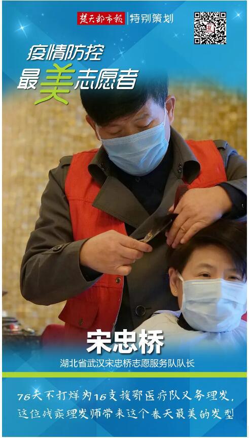 “理发的事儿,就交给我吧。” 为“战疫天使”们义务理发成为了疫情期间宋忠桥的首要任务。队员们出征前剪短发、剃光头的情形深深刺痛了他,他暗自决定,要给战士们这个春天最美的发型。