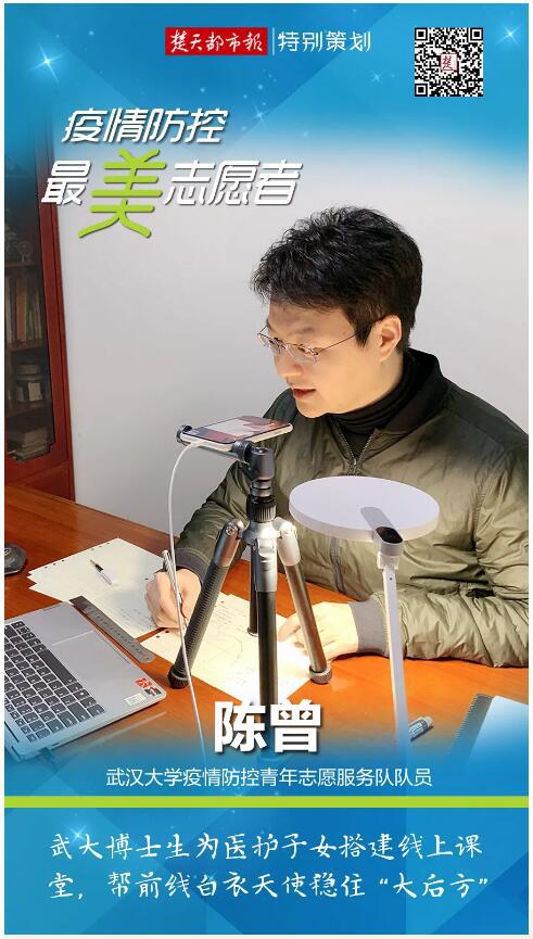 学以致用,学有所长。他组织武大青年志愿者为医务人员子女提供免费线上志愿服务,并根据科目建立备课单元,开设个性化科目。还通过心理帮扶、文化宣传、信息服务、后勤服务、医疗服务等多个方面,凝聚战疫合力。