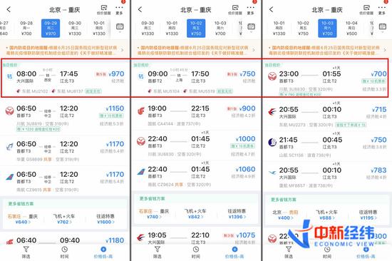 9月30日、10月1日北京到重庆经济舱机票最低价。数据来源:携程旅行APP 9月30日、10月1日北京到重庆经济舱机票最高价。数据来源:携程旅行APP不过,浏览前后几天的票价可以看到,虽然9月29日机票价格优惠不大,但从10月2日起,多个航空公司放出了不足千元的机票。例如,10月2日最低票价为750元,与9月30日、10月1日的最高票价相比,便宜了1420元。因此,从经济情况考虑,若选择乘坐飞机,大家不妨错峰出行。