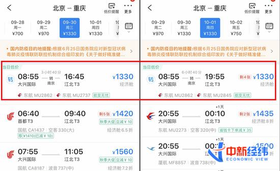 中新经纬客户端查询携程旅行APP发现,9月30日和10月1日出发,热门路线如深圳、广州、上海、北京、成都、重庆等城市的机票价格不菲。以北京到重庆为例,这两日经济舱机票最低价同为1330元,最高价都为2170元,形成840元的票价差。其中,9月30日,北京大兴国际机场飞重庆江北T3的东航MU2273次航班,经济舱机票已售罄,仅剩公务舱全价机票。