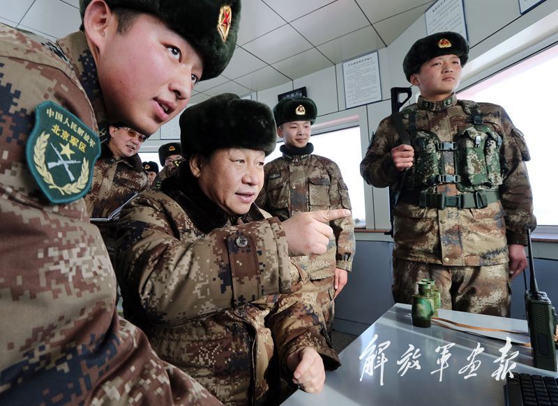 2014年1月26日上午,习近平主席在内蒙古军区边防某团三角山哨所,看望执勤的战士。他动情地对执勤哨兵说:“今天,我和你们一起执勤站岗!”