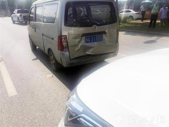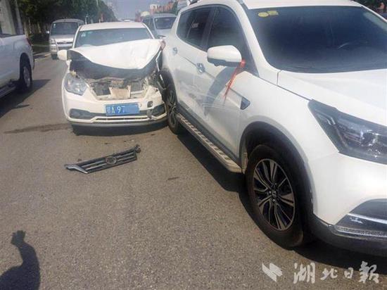 酒驾司机的车辆制造祸端。(视界网 梅胭 摄)湖北日报讯(记者饶纯武、通讯员梅胭)男子酒后驾车昏昏欲睡,撞上等红灯的2辆车后,混在围观群众中间“看热闹”,不料被民警识破。8月1日,酒驾司机裴某被黄陂警方采取强制措施。