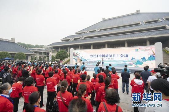 2021年“中国旅游日”主会场活动现场。(新华社记者熊琦 摄)2021年“中国旅游日”启动这一天,“天下江山第一楼”黄鹤楼迎来八方游客。这座千古名楼见证了全国数万名援鄂医疗队员白衣执甲、八方驰援的壮举,也见证了江城武汉春和景明、游人如织的盛况。