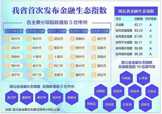 湖北日报讯 湖北日报讯 (记者林建伟、通讯员王晓羽、陈斌斌)金融生态环境建设,事关经济发展和风险防范。4月27日,省政府金融办、省金融生态办首次联合发布湖北金融生态指数,我省2017年金融生态总指数值为83.71,评价等级为A,金融生态呈现稳中向好态势。