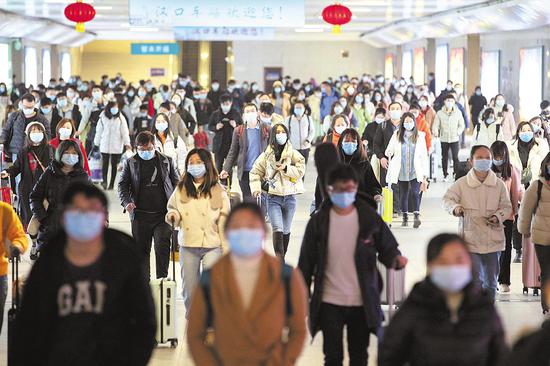 2月17日,汉口火车站,旅客出站。 (湖北日报全媒记者 蔡俊 通讯员 李沙 摄)湖北日报讯 (记者林晶、通讯员孟立、胡滨)春节期间(2月11日至2月17日),中国铁路武汉局集团公司(以下简称武铁)共发送旅客118万人次,比近年同期减少7成左右。假期最后一天,铁路迎来节后探亲返程和返岗高峰,共发送旅客37万人次,创今年春运发送人次新高。其中,武昌、汉口、武汉三大火车站共发送旅客10万人次。春节期间,武汉、汉口、武昌三大客运站共发送旅客36.7万人次。