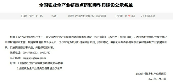 11月15日,农业农村部官网公示了全国农业全产业链重点链和典型县建设名单,湖北1链2县入围。