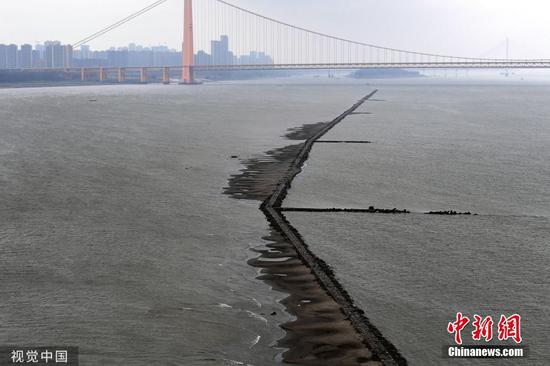 长江武汉段水位降低 江面中心现石子小路