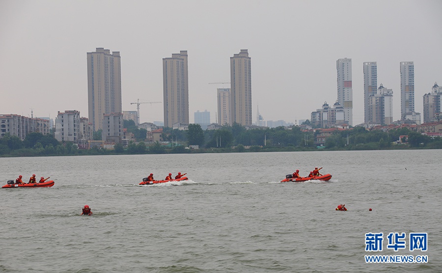图为7月4日,武汉市消防救援支队在汤逊湖组织开展活饵救援训练。新华网发 李国柱摄
