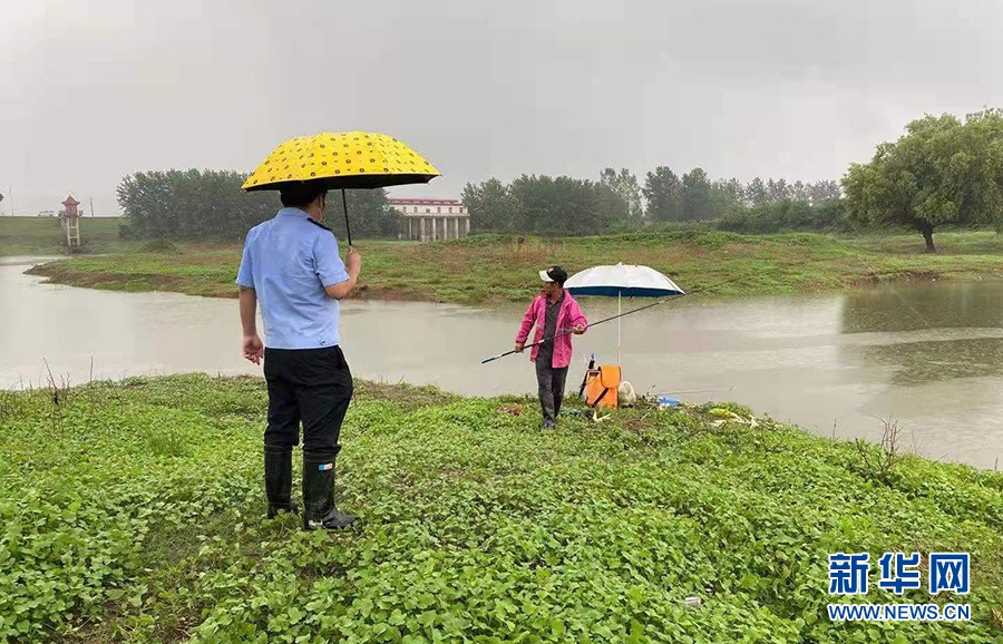 图为本轮强降雨期间,浠水县公安民警劝导垂钓爱好者远离危险水域。新华网发