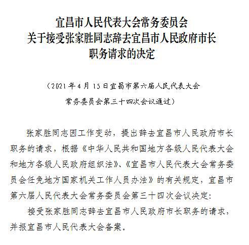 4月15日,市六届人大常委会召开第三十四次会议。市人大常委会主任王国斌主持会议。会议接受张家胜辞去宜昌市人民政府市长职务,决定任命马泽江为宜昌市人民政府副市长、代理市长,上官福令为宜昌市人民政府副市长。