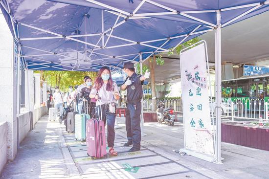 6月8日,武汉大学首批毕业生返校,图为排队进校(资料图片,记者黄士峰 摄)