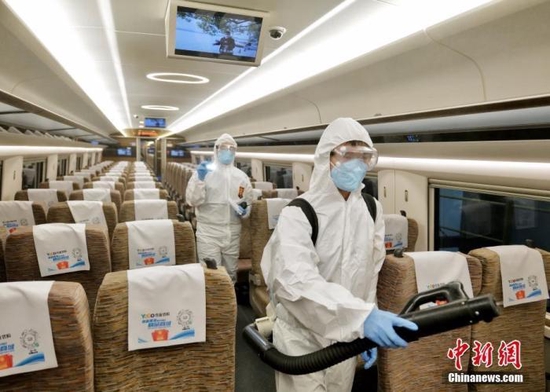 资料图:防疫工作人员对每节车厢进行消杀处理。 中新社记者 陈文 摄